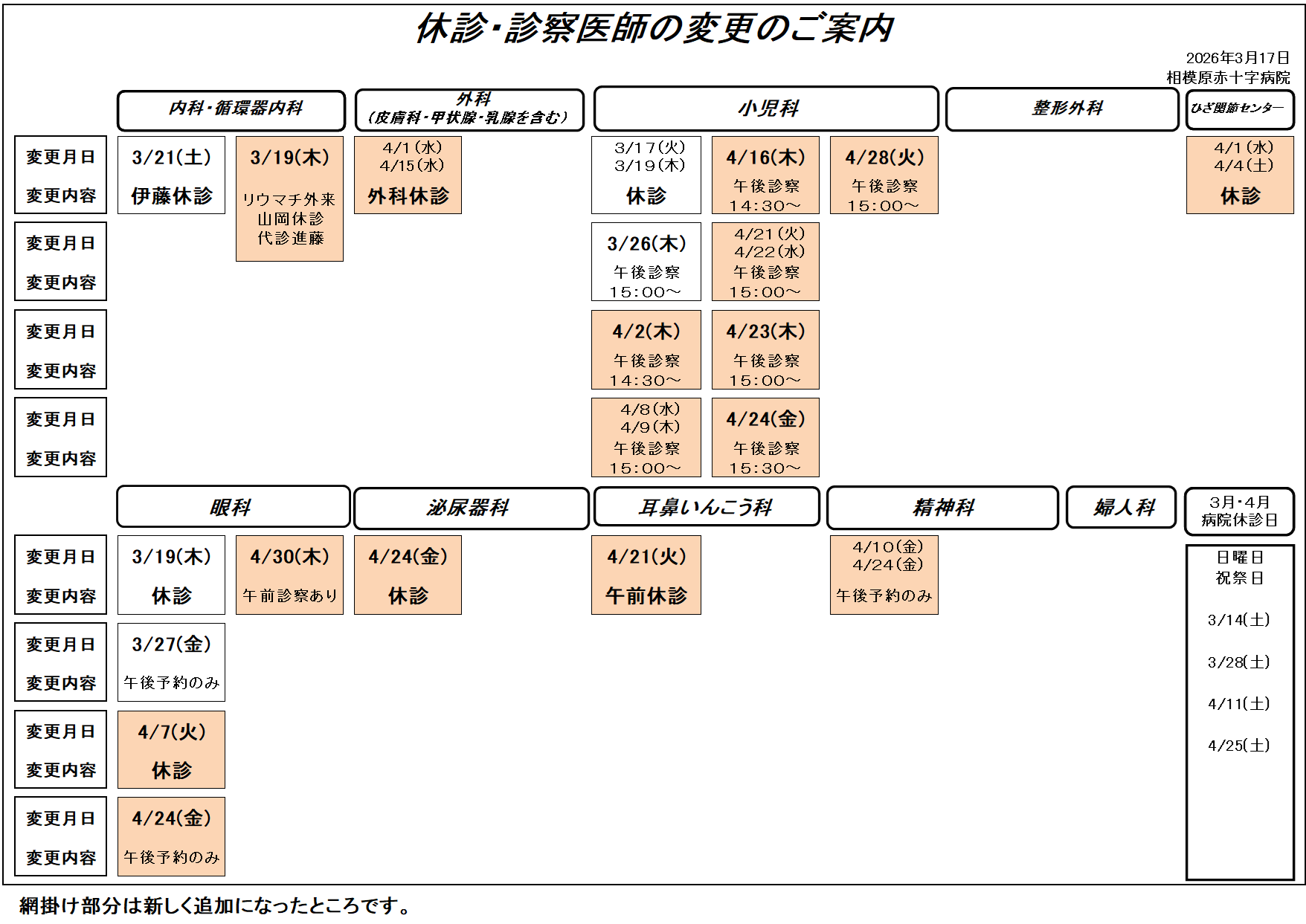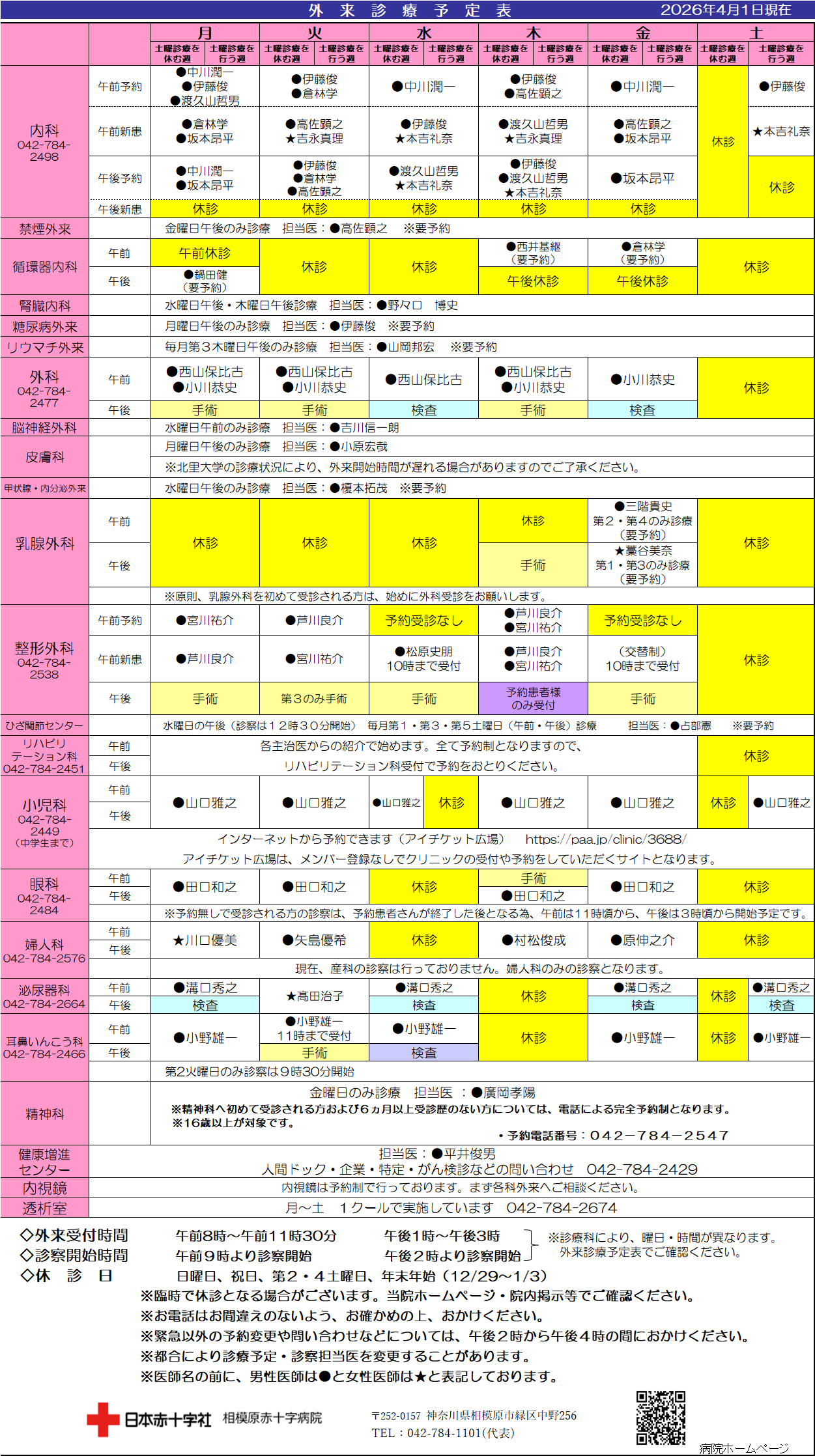 外来診療予定表・臨時休診情報・病院カレンダー 外来診療予定表 外来診療予定表 ※小児科については小児科診療予定表もご覧下さい。 臨時休診情報 2026-3-17時点 臨時休診情報 病院カレンダー 病院カレンダー